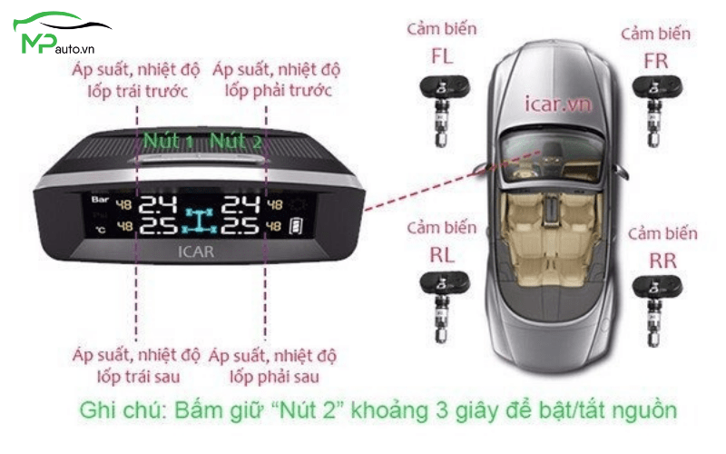 Các van cảm biến icar truyền tín hiệu áp suất, nhiệt độ thời gian thực. Bằng tần số 433.92 MHz đến màn hình hiển thị đặt taplo. Tại đây, dữ liệu được xử lý và hiển thị trên màn hình đặt taplo.